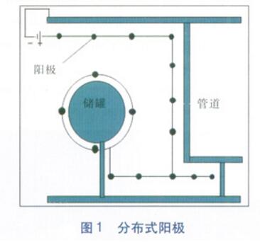 分布式陽極可有效地改善電流分布,使保護結(jié)構(gòu)上的電位均勻分布。當(dāng)陰極電纜或管道太長時,應(yīng)考慮其電阻對電流的影響。必要時,可以另加陰極電纜和陽極電纜。保護結(jié)構(gòu)復(fù)雜時,經(jīng)常采用分布式陽極,見圖1。
