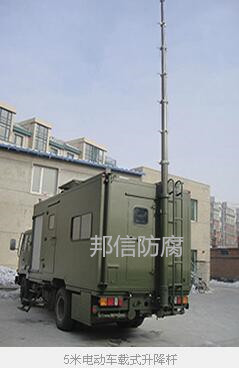 自動升降避雷針根據(jù)安裝方式的不同,可分為固定式和移動式。移動式車載避雷針防雷裝置與同類產(chǎn)品相比,具有升降速度快、可靠性高、耐久性強、穩(wěn)定、重量輕、閉合高度小、攜帶方便等特點。升降方式分手動和電動、自動三種,邦信車載升降式避雷針防雷裝置可升高高度為3—30米,閉合高度在1.2-5米,主桿重量15Kg-200Kg。廣泛適用于移動、消防、水利、鐵路、電力、建筑、野外施工、大型文體活動、抗災(zāi)救災(zāi)等應(yīng)急的雷電防護。使用自動升降式避雷針,能使野外工作更加方便sfe。 車載自動升降式防雷裝置系統(tǒng),由車載避雷針和接地裝置組成,避雷針包括:豎直固定于車上的絕緣外套,固封在該外套腔體內(nèi)的絕緣內(nèi)套、封裝在該內(nèi)套中纏繞于絕緣棒上的彼此呈反向螺旋、且為并聯(lián)的一對無感應(yīng)繞組,固連于該繞組上端頭的接閃器,固連于該繞組下端頭的引下線接頭座;接地裝置包括:行車狀態(tài)中,與避雷針引下線接頭座連接的引下線接地電纜,該電纜與引下線接頭座連接、而底端為多分枝的接地導綫;停車狀態(tài),與避雷針引下線接頭座連接的引下線接地電纜,其與引下線接頭座連接、底端與固定在地面上的金屬接地樁連接,接地電阻應(yīng)符合GB50057-2010規(guī)范要求;優(yōu)點是結(jié)構(gòu)簡單、能抑制雷電的電磁感應(yīng),避免遭受雷擊,提高了車輛及裝備對雷電的防護能力。